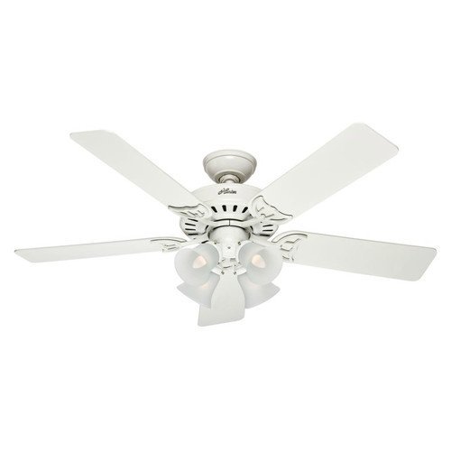 Featuring classic good looks, the Hunter 52-inch Studio series ceiling fan will add beauty and comfort to your home. As functional as it is attractive, this white fan includes an elegant four-light fixture and a reversible five-blade design in White/Bleached Oak. Powered by a high performance, Whisper Wind Motor it delivers ultra-powerful air movement with whisper-quiet performance so you get the cooling power you want, without the noise you don't.